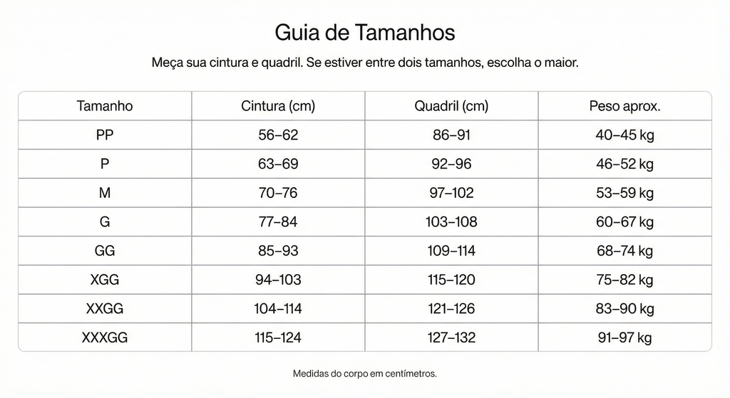 Caso esteja entre dois tamanhos, opte pelo maior.